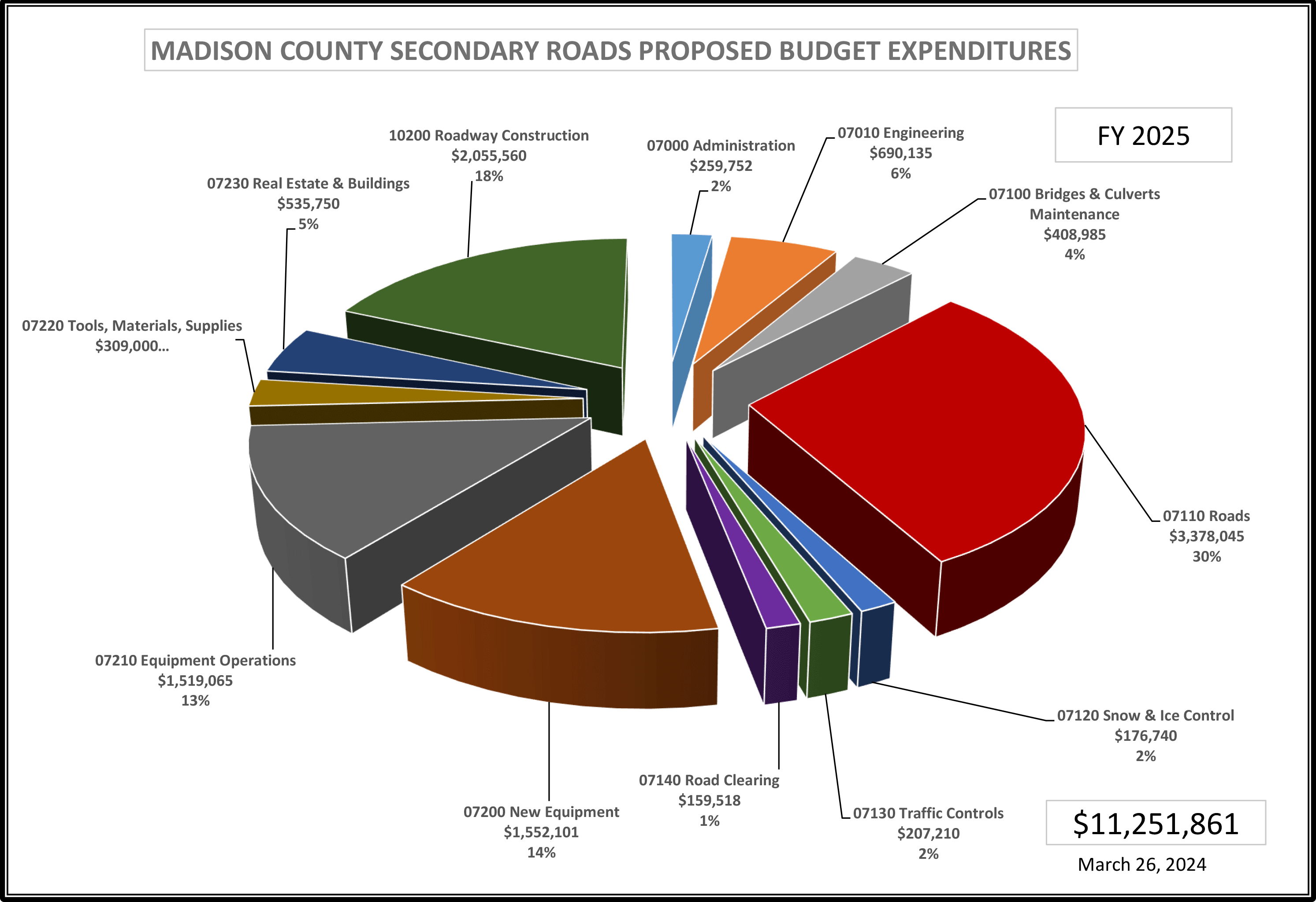 The Engineer’s Office is responsible for the planning, design and supervision of all construction and maintenance work on the secondary road system. The County’s road system includes 910 miles of roads. Of that total 104 miles are paved. There are 245 bridges on the county road system.