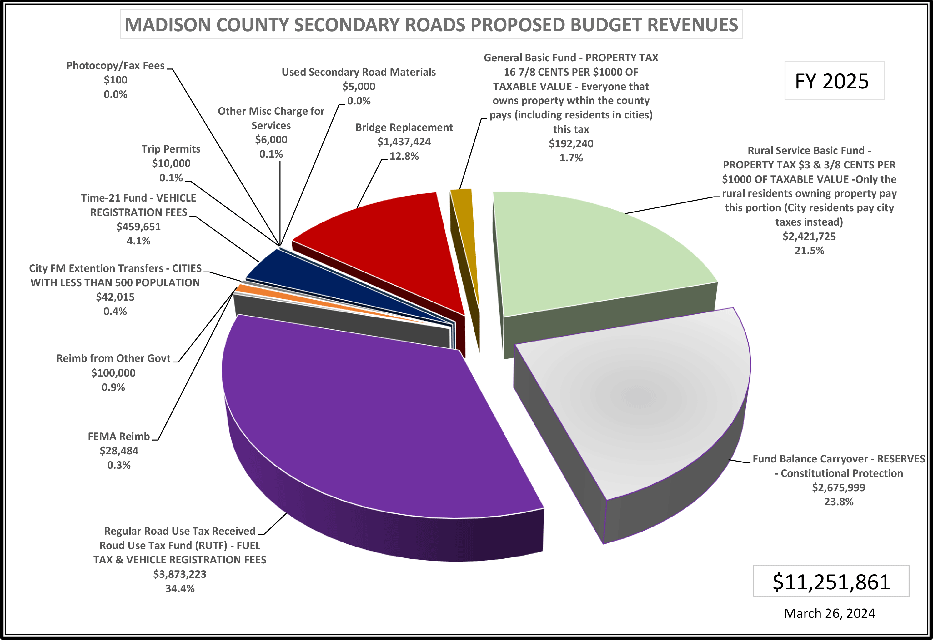 The department operates on an approximate annual budget of $11,251,861. The proposed budget revenues and expenditures are listed below: